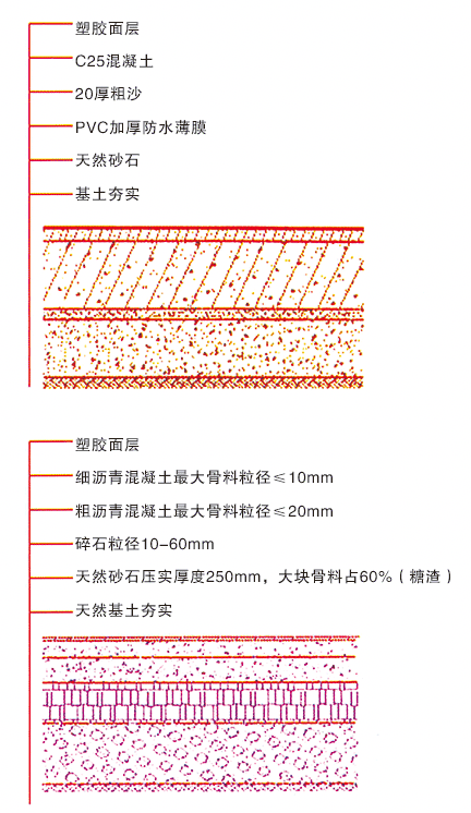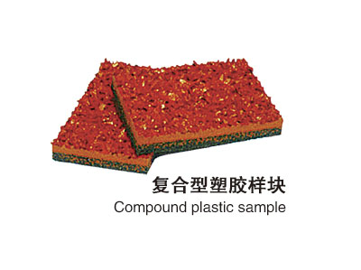 復合型塑膠跑道:底層用聚氨酯單組份膠水混合黑色橡膠粒攤鋪,施工方法同透氣型。面層用聚氨酯雙組份材料加入填充料現場澆注而成,施工方法同混合型。