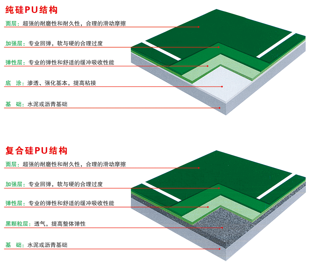 環保型硅PU系新發展的環保球場彈性材料,由德國引進。材料組成為水性有機硅彈性分散液和水性PL液為基礎樹脂,配合骨料、填料、色漿、微細硅纖維及其他添加劑組成。